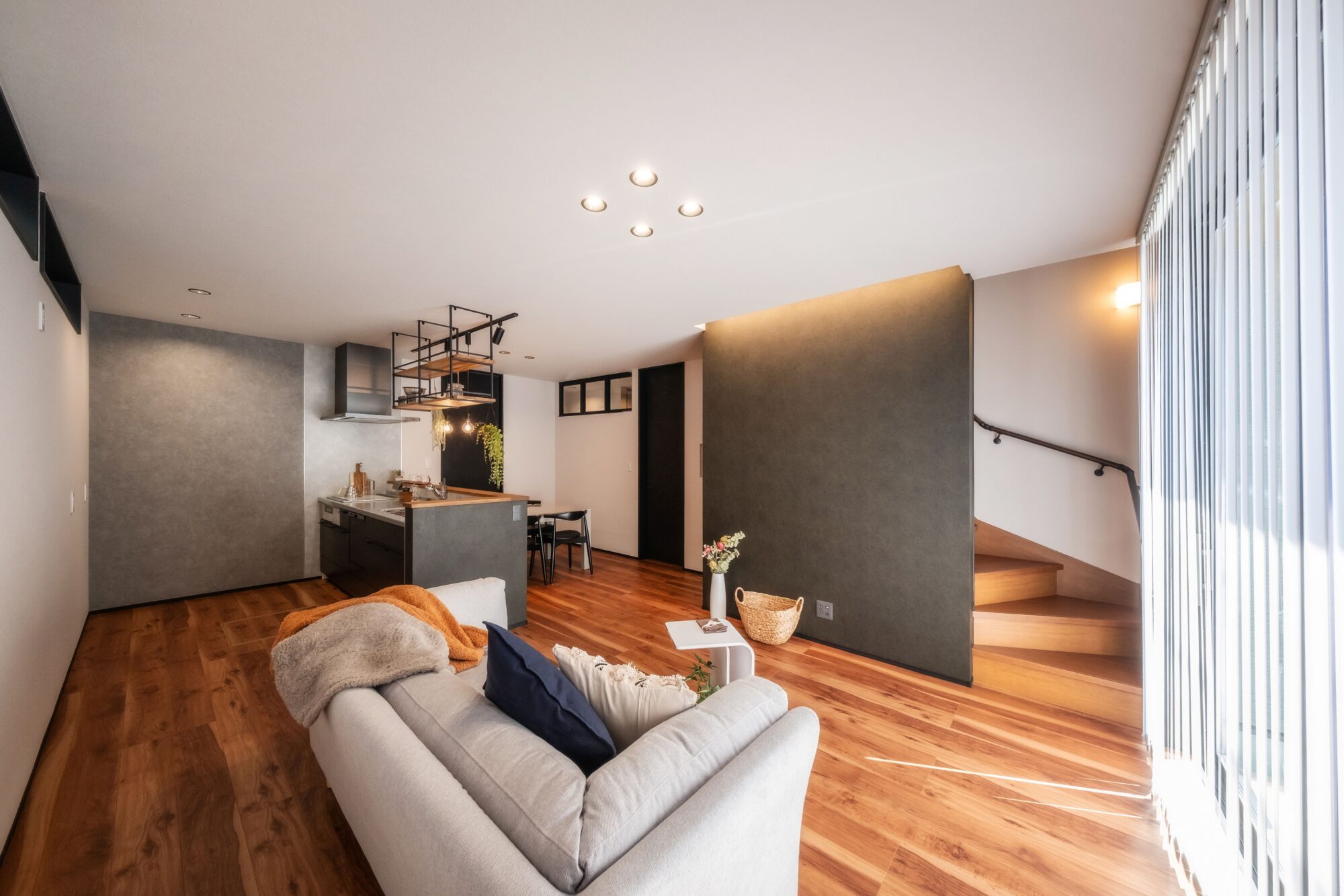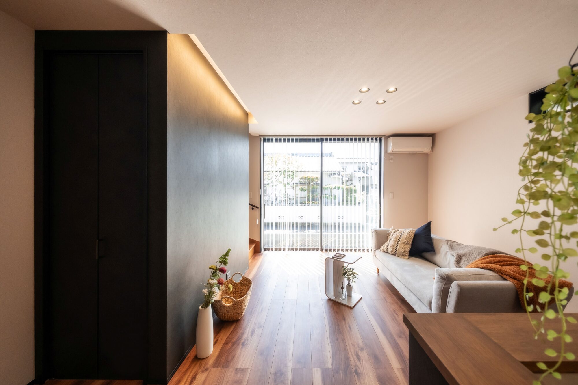 アクセントウォールが空間全体をモダンで引き締まった印象にしています。