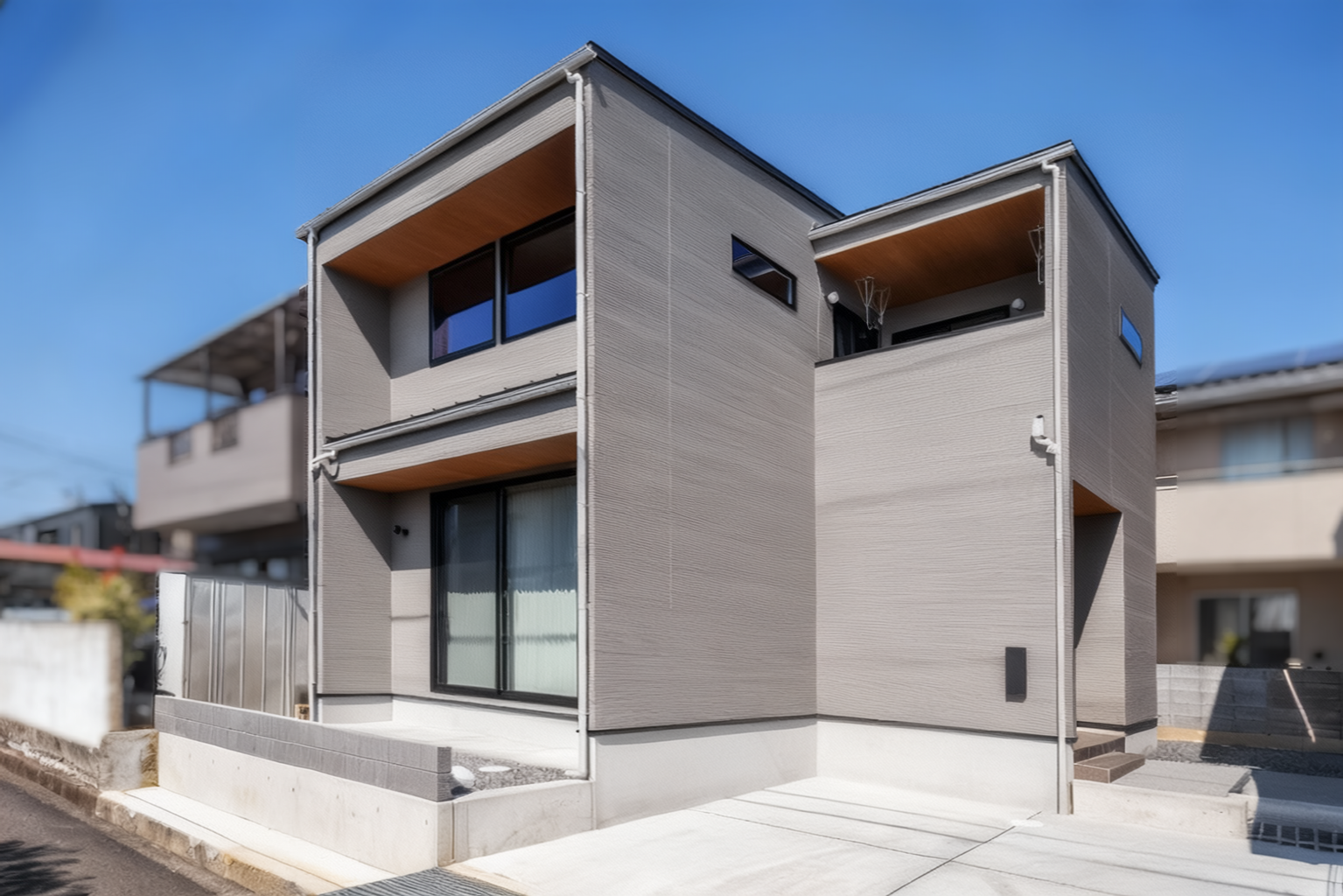 グレーの外壁に、木目調の軒天と黒サッシがモダンなアクセントを加える、