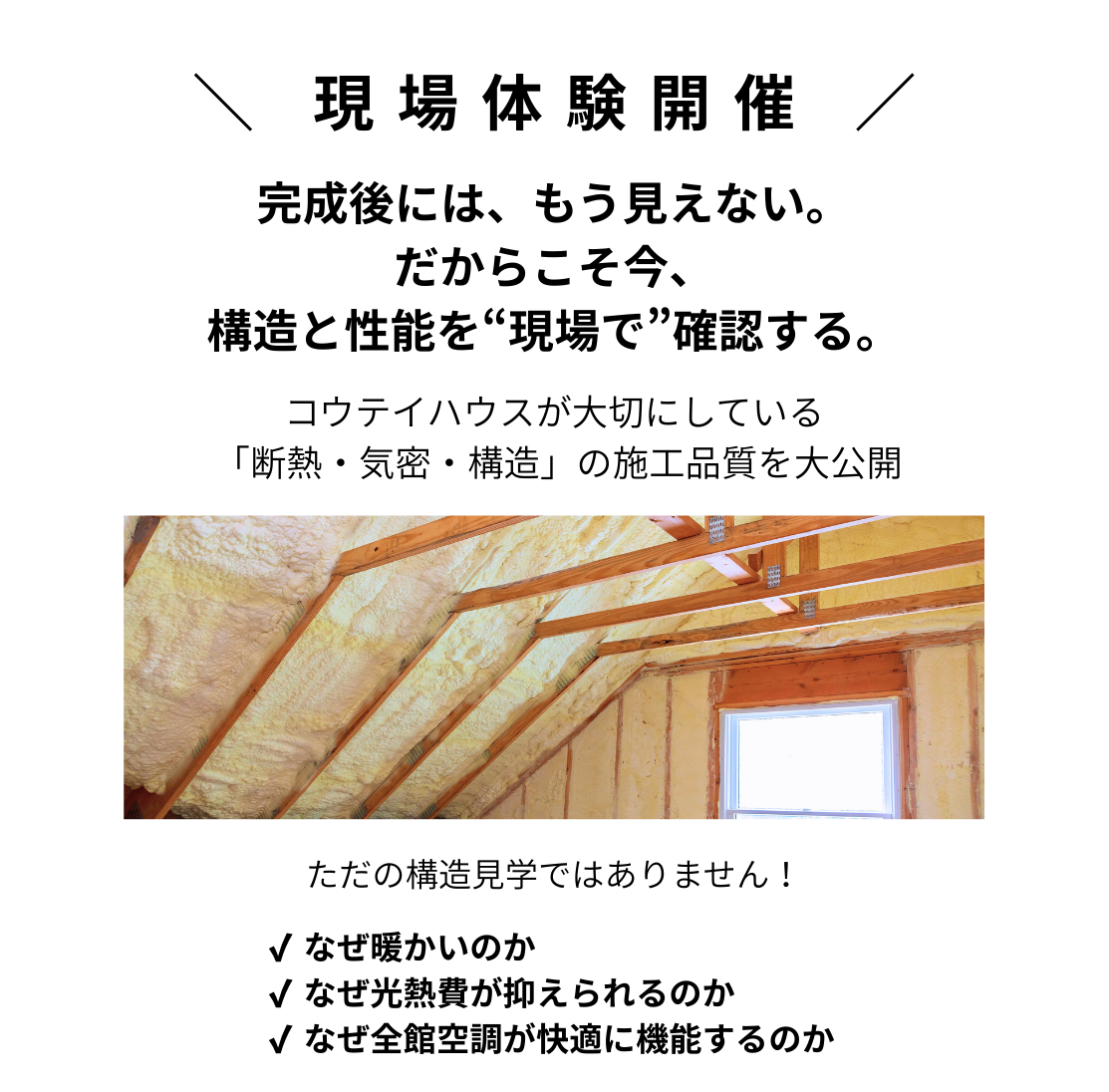 【すごい!】完成後には見えない“本当の安心”を大公開【現場体験】 見学会 受付中 NEW 開催日:常時開催 お問い合わせはこちら お問い合わせはこちら イベント来場予約 下記に必要事項を入力し、「確認画面に進む」ボタンを押してください。 事前にご予約をいただきますと、お客様のご要望に沿った最適な準備ができ、より多くのご提案が可能です。 お急ぎの場合はお手数ですが、お電話でご予約ください。 参加イベント名 【すごい!】完成後には見えない“本当の安心”を大公開【現場体験】 参加希望日 来場時間を選択 来場時間を選択 お名前 ふりがな ご住所 郵便番号 都道府県 選択してください北海道青森県岩手県宮城県秋田県山形県福島県茨城県栃木県群馬県埼玉県千葉県東京都神奈川県新潟県富山県石川県福井県山梨県長野県岐阜県静岡県愛知県三重県滋賀県京都府大阪府兵庫県奈良県和歌山県鳥取県島根県岡山県広島県山口県徳島県香川県愛媛県高知県福岡県佐賀県長崎県熊本県大分県宮崎県鹿児島県沖縄県 市区町村番地 建物など 電話番号 メールアドレス 人 数 大人 123456789 11歳以下 0123456789 6歳以下 0123456789 3歳以下 0123456789 土地の有無 土地なし土地あり お問い合わせ内容 アンケート 弊社のHPで気になった部分はどこですか? コウテイハウスとは 商品ラインナップ 施工事例 その他 何を見て当社HPを知りましたか?※複数可 SUUMOネット(ポータルサイト) 検索サイト(googleやYahooなど) WEB広告(バナーなど) チラシ(ポスティング) チラシ(折込) Instagram Facebook 看板 紹介 その他 ご計画の内容は? 土地探し+注文住宅 建て替え ご計画の時期は? 半年以内 1~2年以内 2年以上先 建設予定地の有無 有り 無し 検討中物件がある Japan 当社の個人情報保護方針について、ご同意の上、確認画面へお進みください。 同意する 見学会 受付中 NEW 【全館空調】1.5階型平屋!実例体感見学会【オーナー様邸見学会】 開催日:3.21 (土) 〜 3.22 (日) 見学会 受付中 NEW 【OPEN HOUSE】バランスを大切にした、“ちょっといい”イナフな住まい。【イナフハウス】 開催日:3.14 (土) 〜 3.15 (日) 見学会 受付中 【OPEN HOUSE】帰りたくなる、空がある。心まで広がる吹き抜けのある家【Trip】 開催日:2.28 (土) 〜 3.1 (日) 一覧をみる