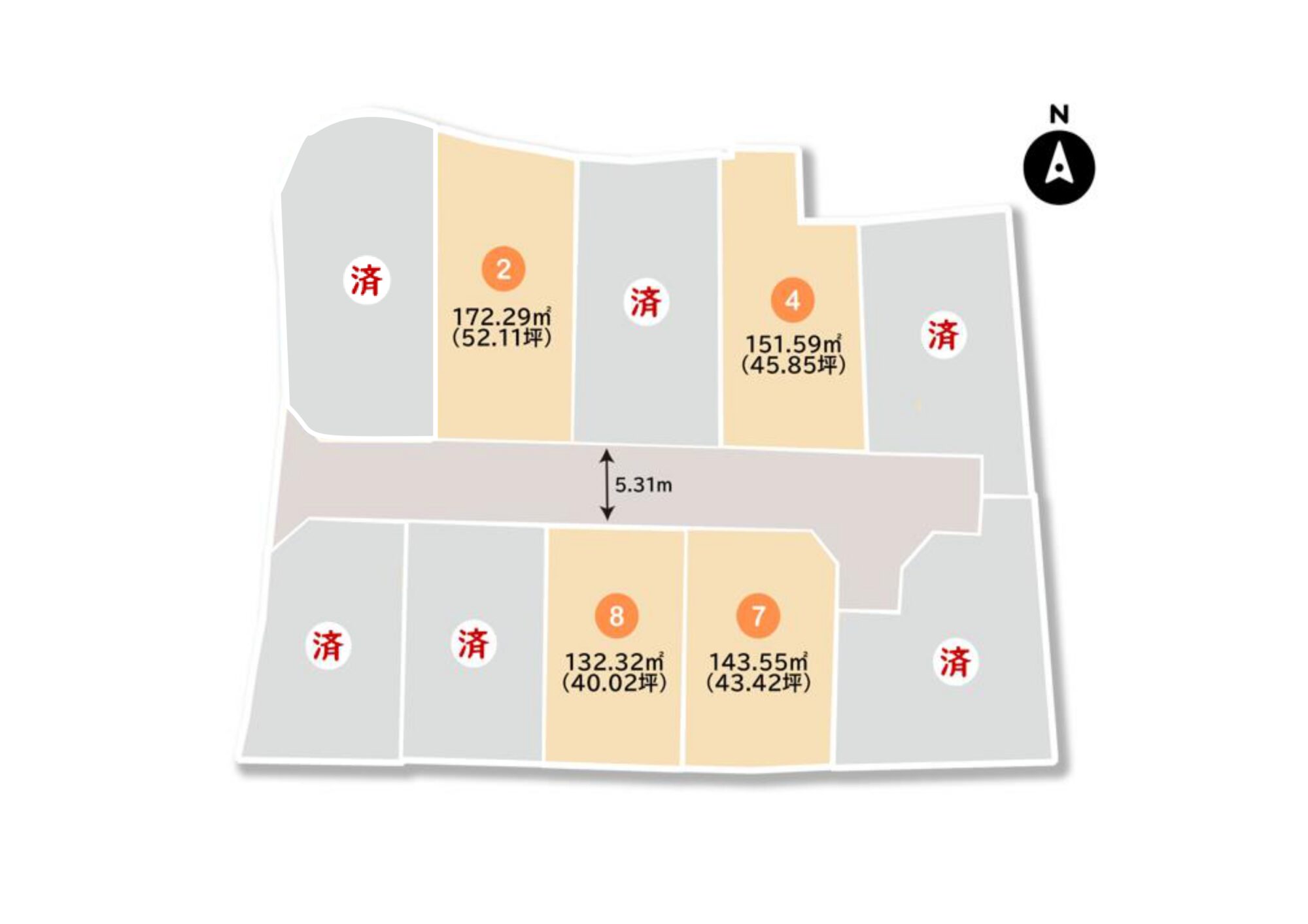 | 区画8 | 販売中 | 132.32㎡ | 40.02坪 | 10,205,100円 |