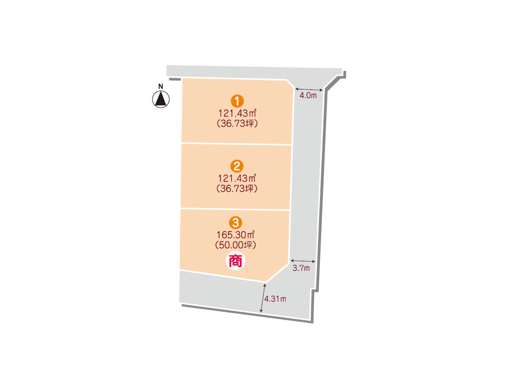 | 区画1 | 販売中 | 121.43㎡ | 36.73坪 | 14,251,240円 |
