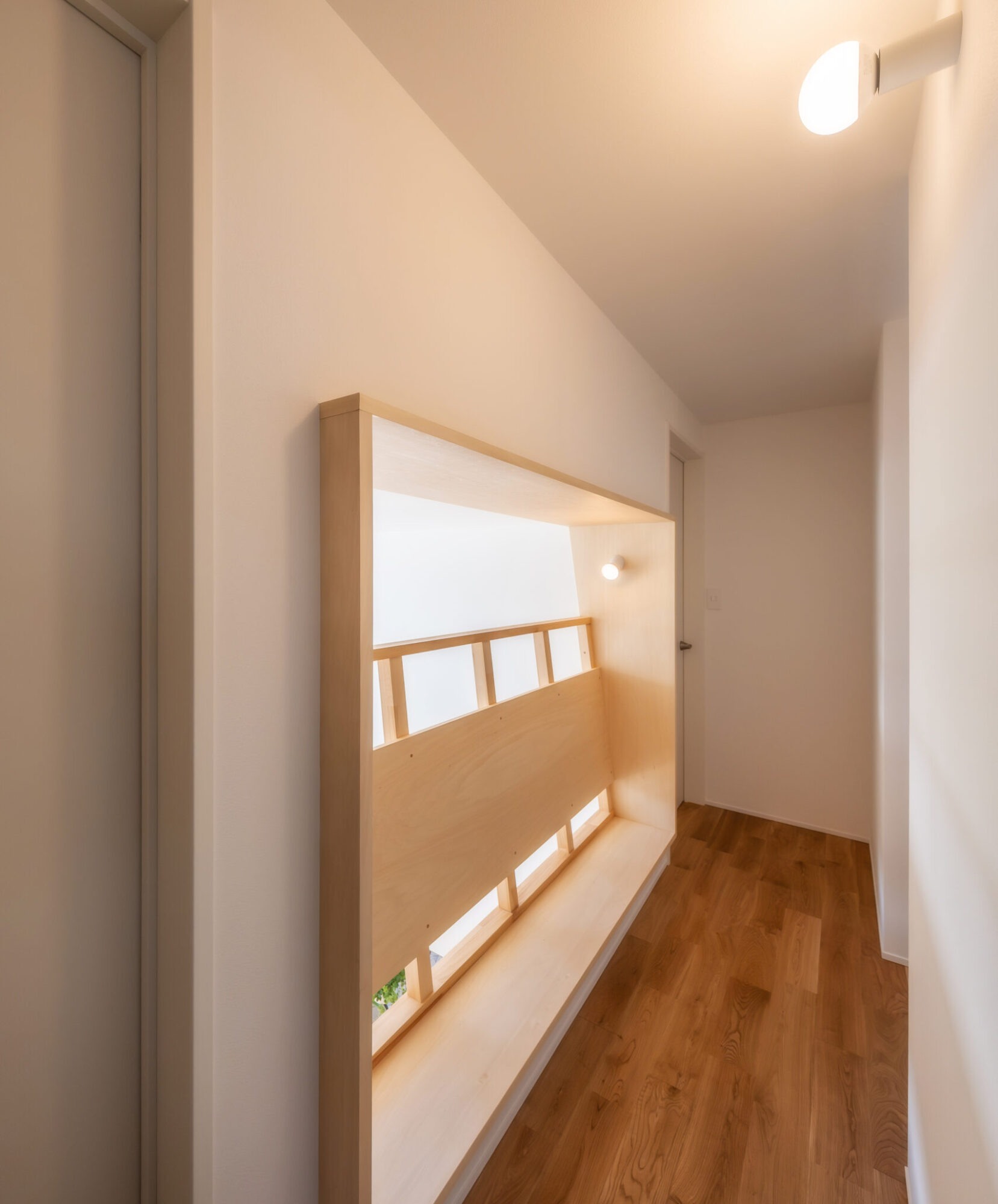 シナ合板を用いた家具や建具は、空間に統一感と柔らかさを与え、既製品にはない味わいを演出。