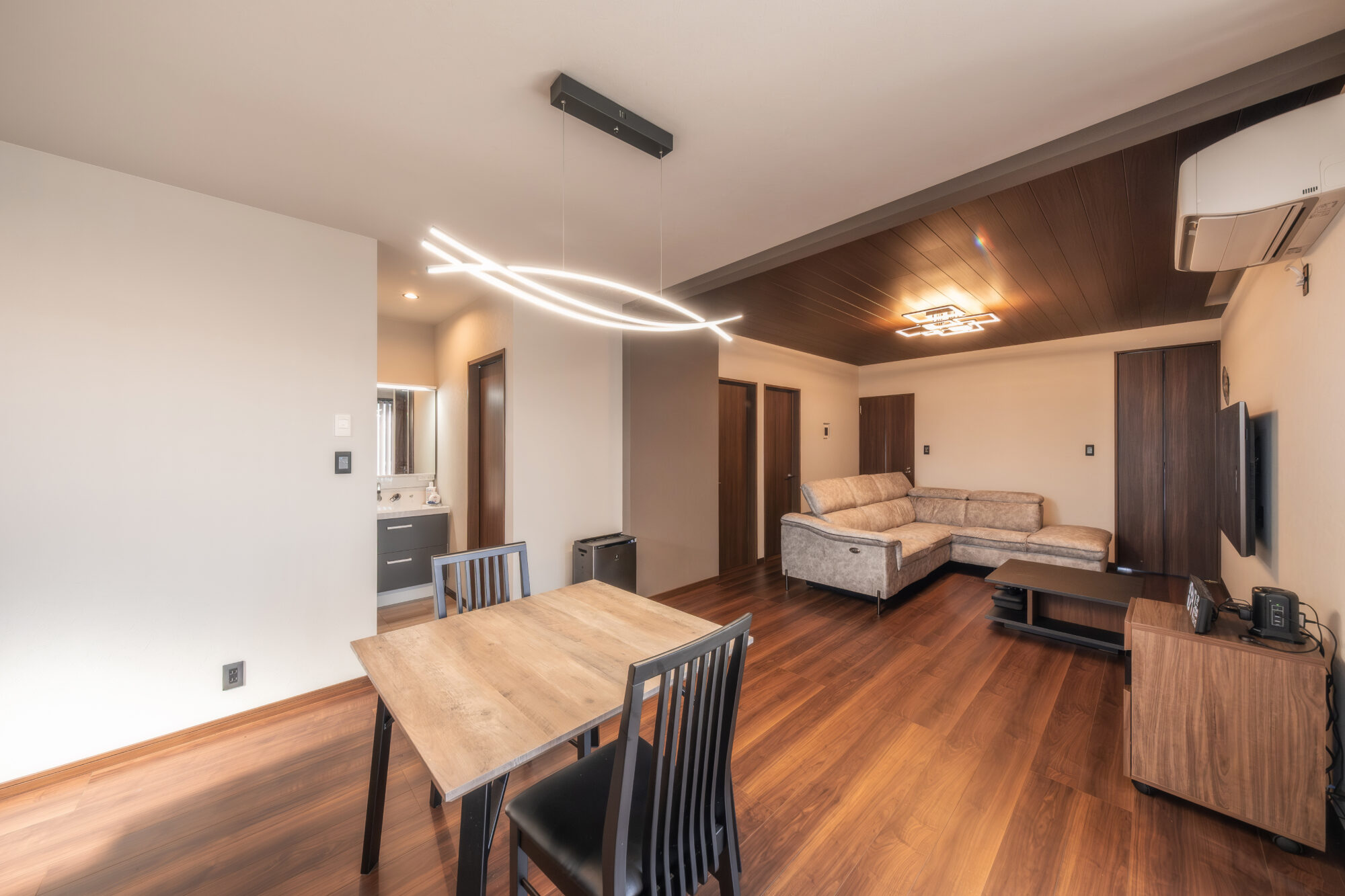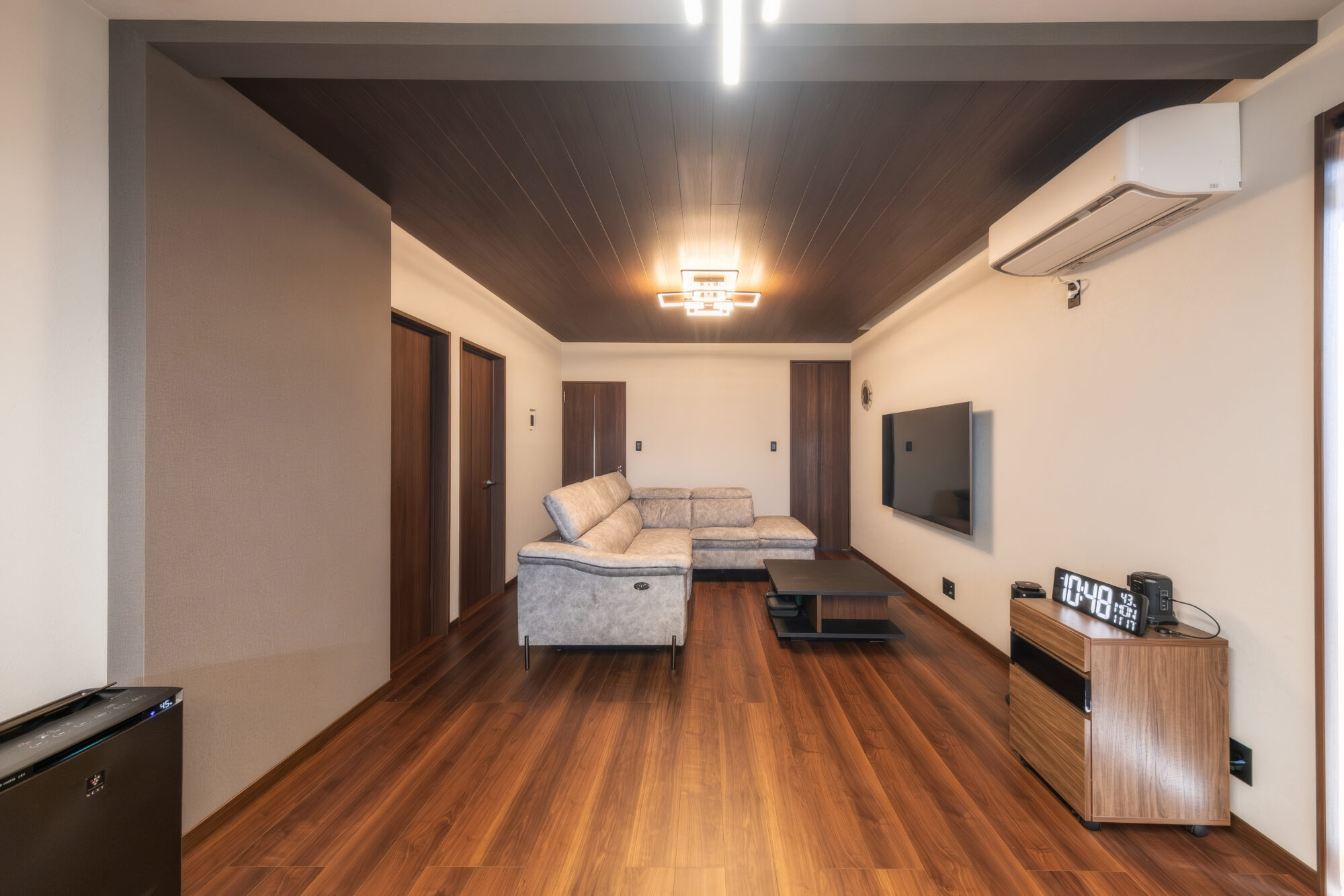 濃い木目調の折り下げ天井とフローリングが、間接照明と相まって、まるで隠れ家のような安らぎの空間を演出。
