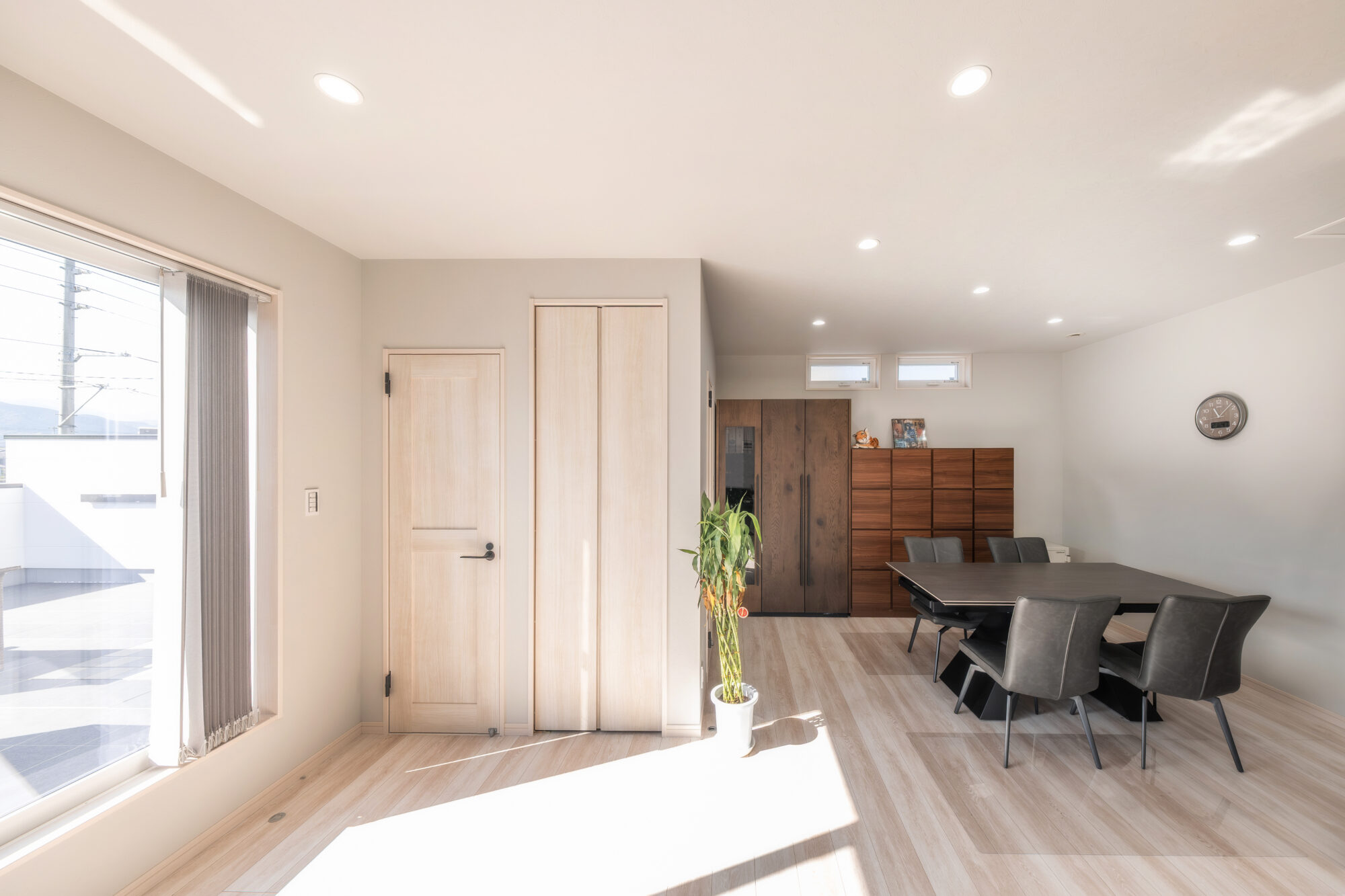奥には、落ち着いた色合いのダイニングセットと、重厚感のある木製収納を配し、デザイン性と機能性を両立させました。