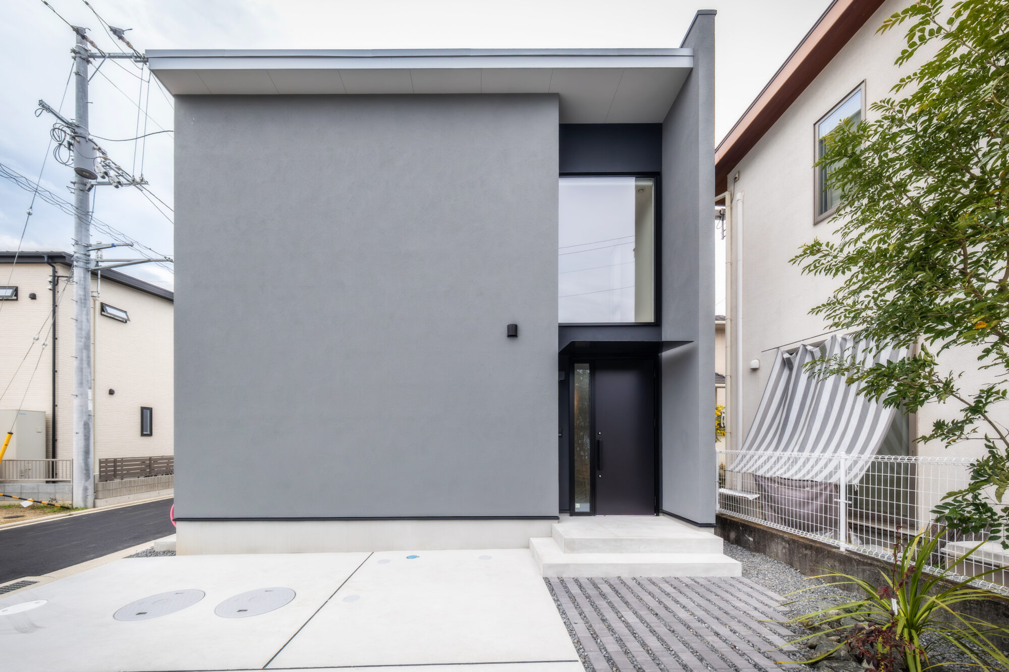 まず目を引くのは、グレーの塗り壁が美しいスタイリッシュな外観。