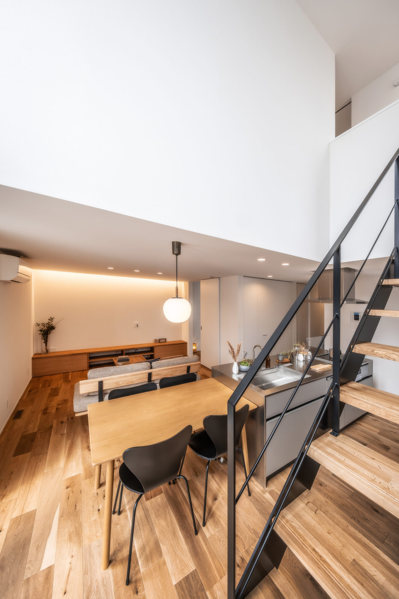 上下に突き抜けるような圧倒的な開口部が、室内にたっぷりの自然光を採り込み、