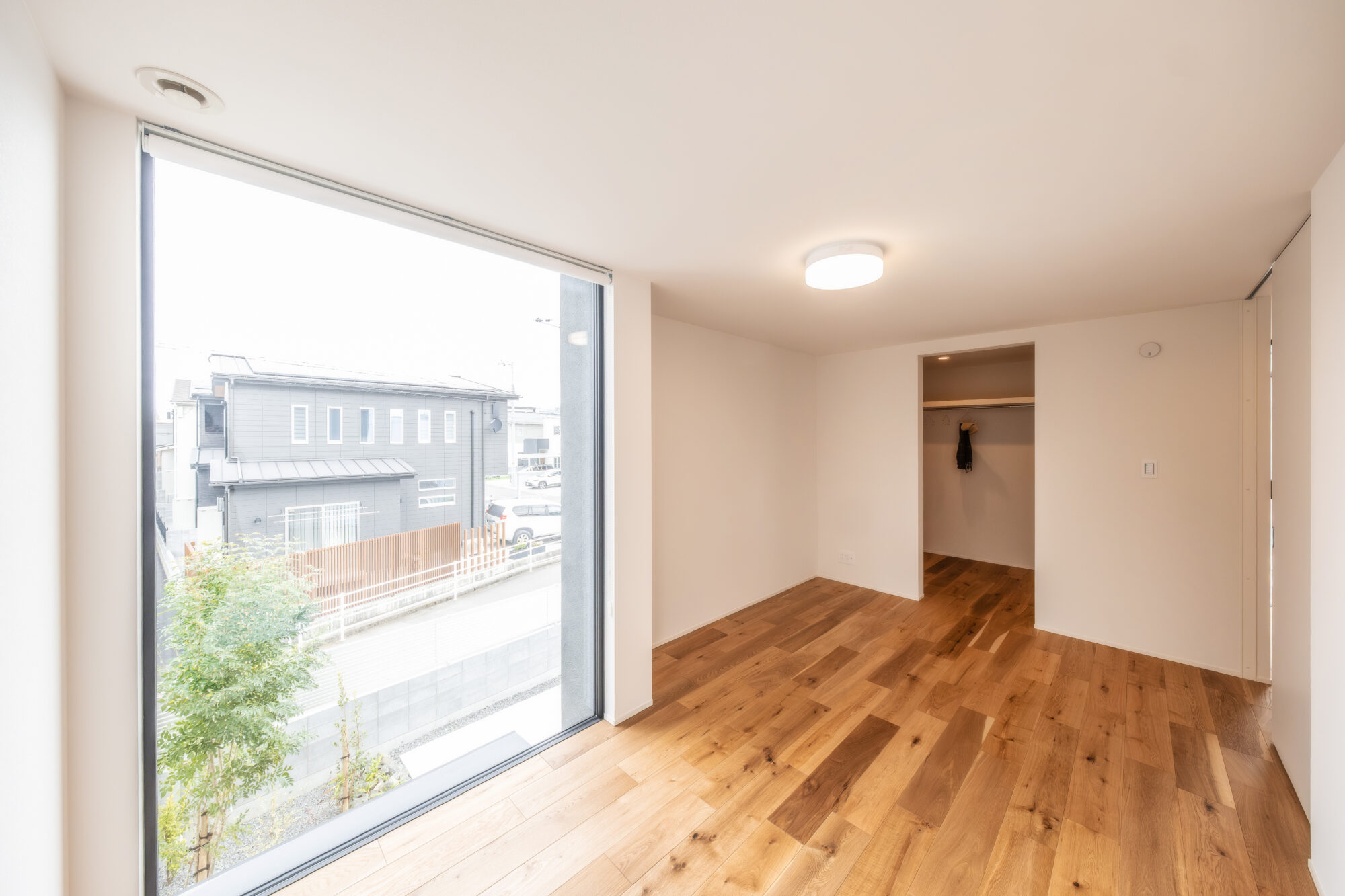 このお部屋の主役は、壁一面に広がる大胆な一枚ガラスの窓です。